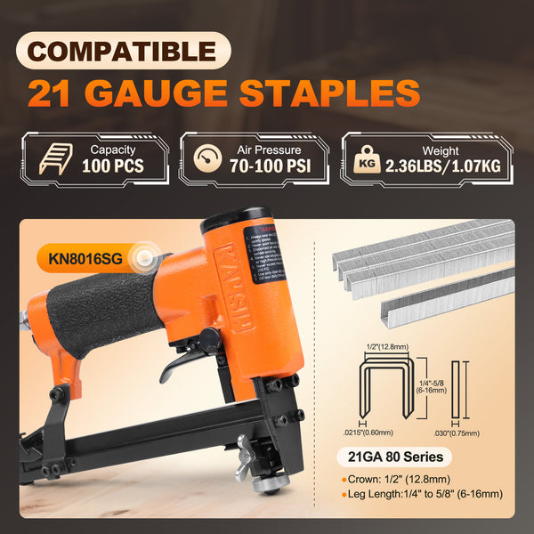 KAMSIN KNL8016 21 Gauge Pneumatic Upholstery Stapler with Extended Long Magazine, 1/2-Inch Crown Staples, 1/4-Inch to 5/8 -Inch(6-16mm) Leg Length, Air Power Fine Wire Stapler for Furniture, Cabinets
