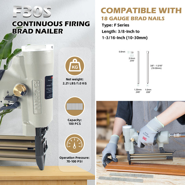 Woodpecker F30S Pneumatic 18 Gauge Brad Nailer 3/8-Inch to 1-3/16-Inch (10-30mm) Length Air Power Continuous Firing Brad Nail Gun Safety Finish Nail Gun for Woodworking Crafts
