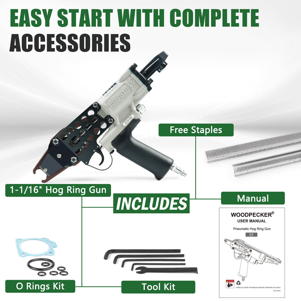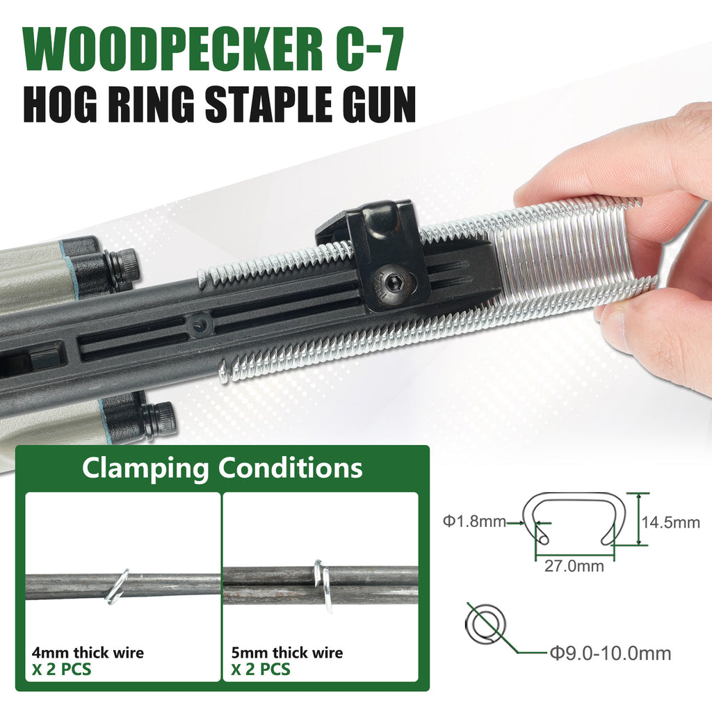 *Hog Ring Gun WOODPECKER C7 hog ring gun, suitable for 15 gauge hog ring staples. Suitable for heavy work. Weight 1.54Kg (4lbs), requires 6-8 bar air pressure to operateto operate