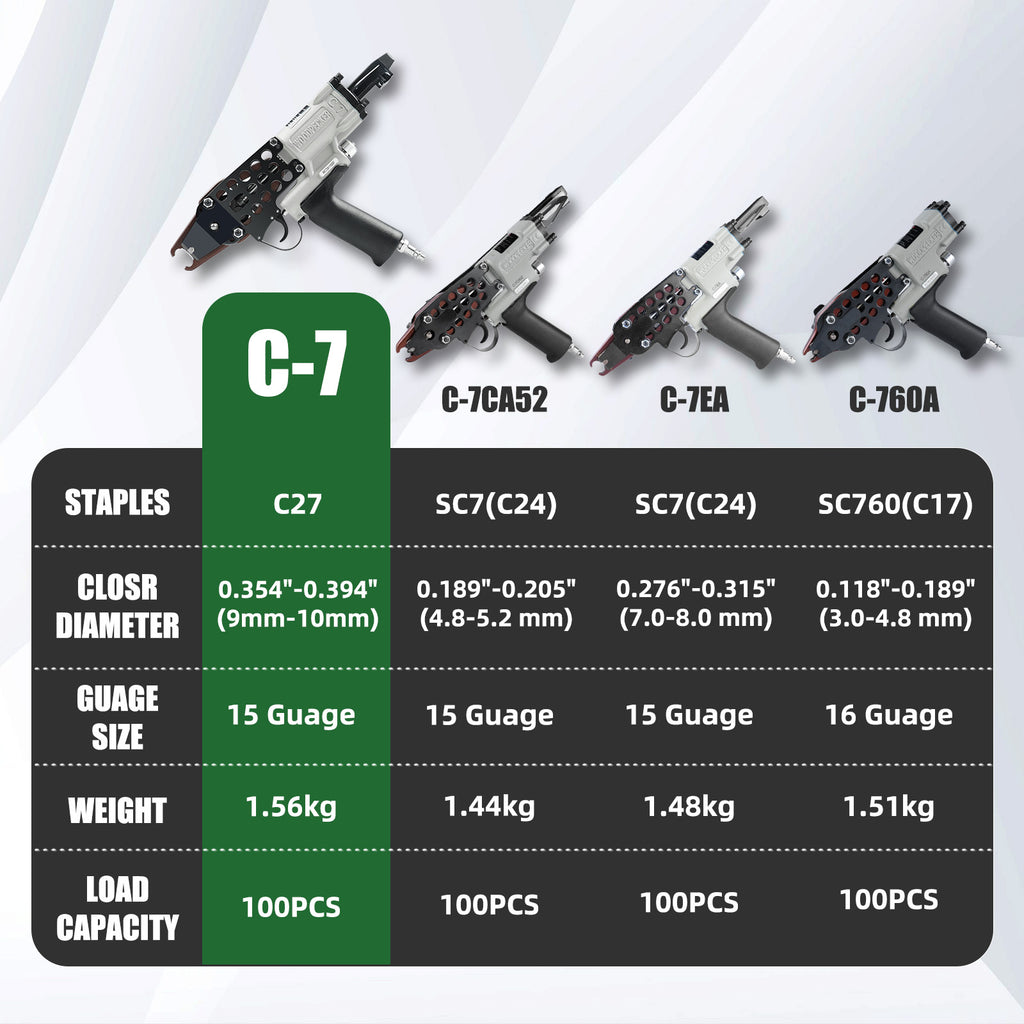 *Suitable for mattress manufacturing Compared to the K-SC7C and K-SC7E, it has a larger closing diameter 3/8"(9mm-10mm) for larger jobs. It is ideally suited for industrial production in,sunch as mattress manufacturing. Save labor and increase productivity!