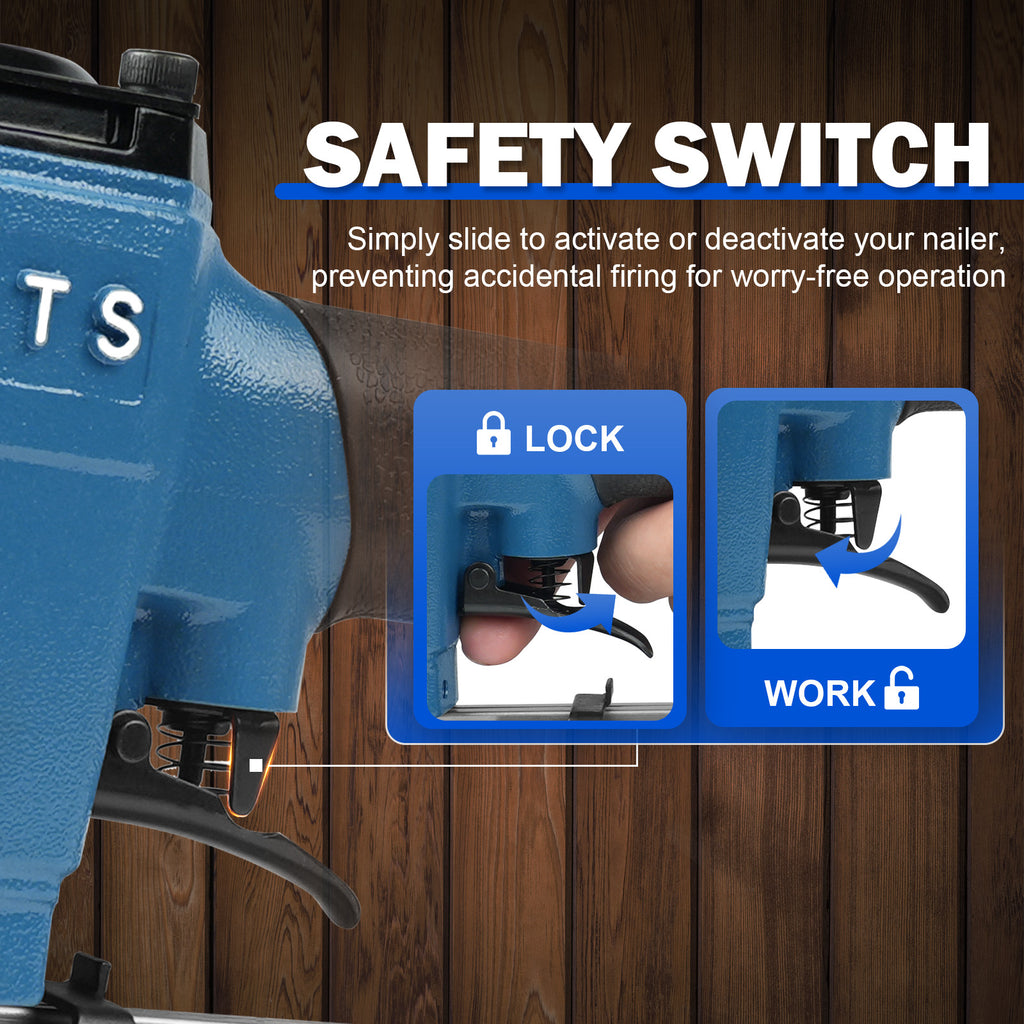 SAFETY DESIGN: Equipped with a rotary safety lock, it greatly enhances operational safety, prevents accidental nail driving due to accidental touch of the trigger, and avoids injury to the operator