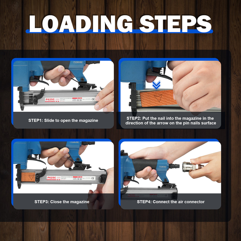 FLEXIBLE ADAPTATION: P625C 23 pneumatic pin nailer magazine capacity of 150PCS, adaptable length of 1/2 inch to 1 inch (12-25 mm) headless pin nails, to reduce the frequent change of nail trouble