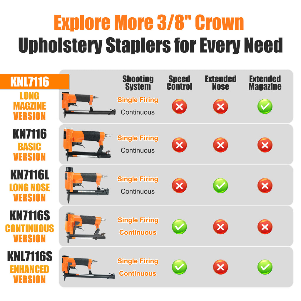 Home/Products/Kamsin KNL7116 22 Gauge Extended Magazine Pneumatic Upholstery Stapler, 3/8-Inch Crown, 1/4-Inch to 5/8-Inch Leg Length, Fine Wire Stapler Gun for Furniture and Fabric Attachment