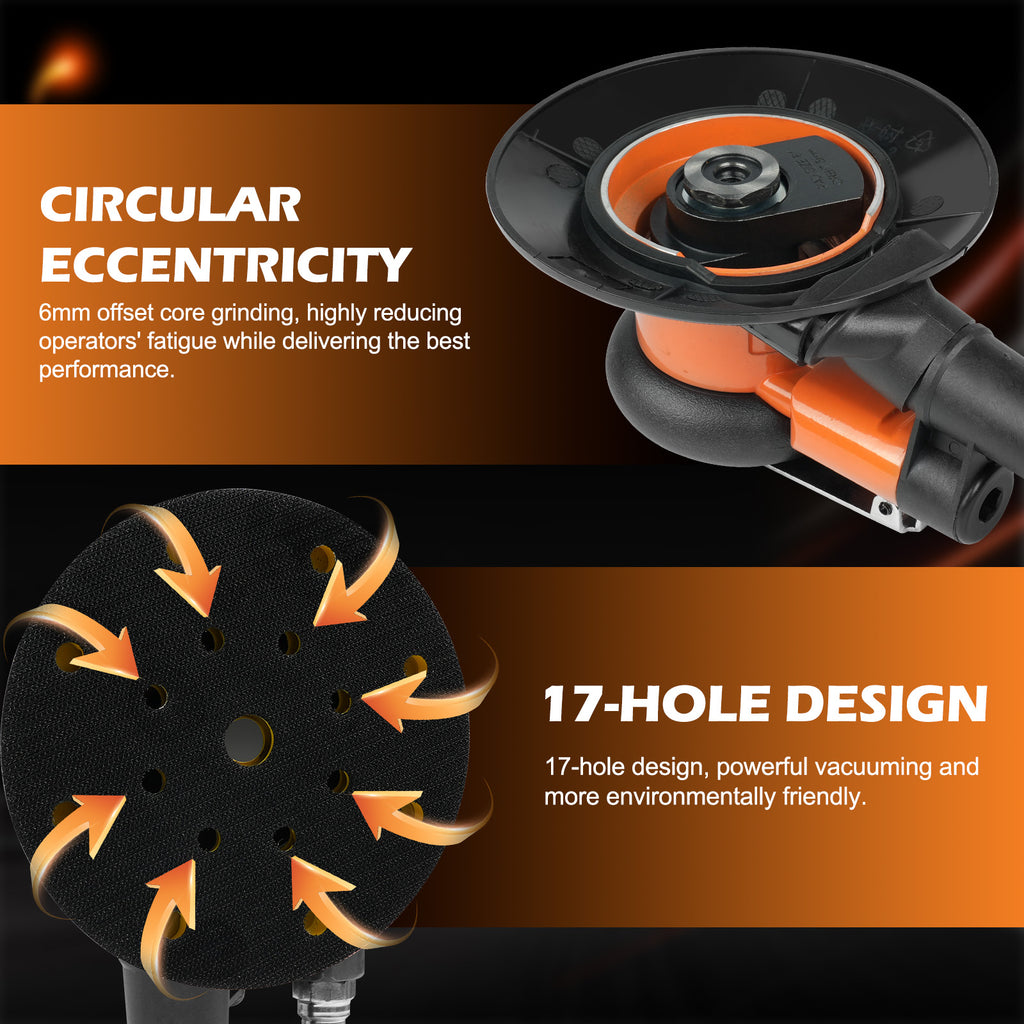 【CIRCULAR ECCENTRICITY】5mm offset core grinding, highly reducing operators' fatigue while delivering the best performance. 6-hole design, powerful vacuuming and more environmentally friendly